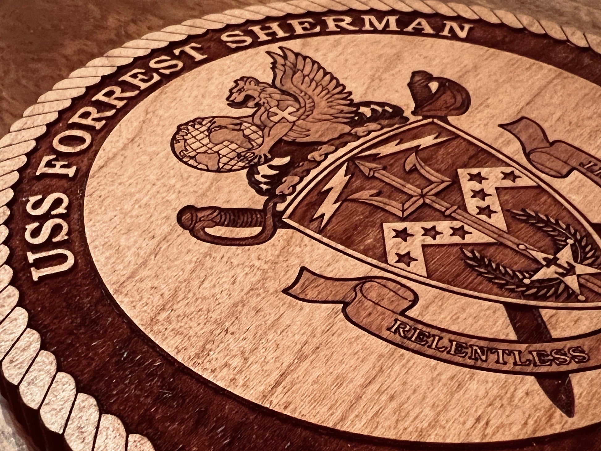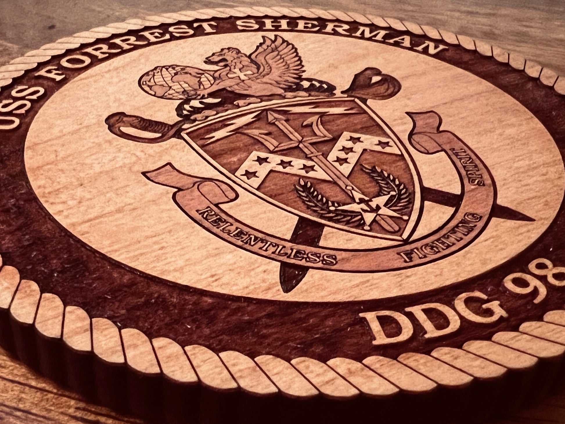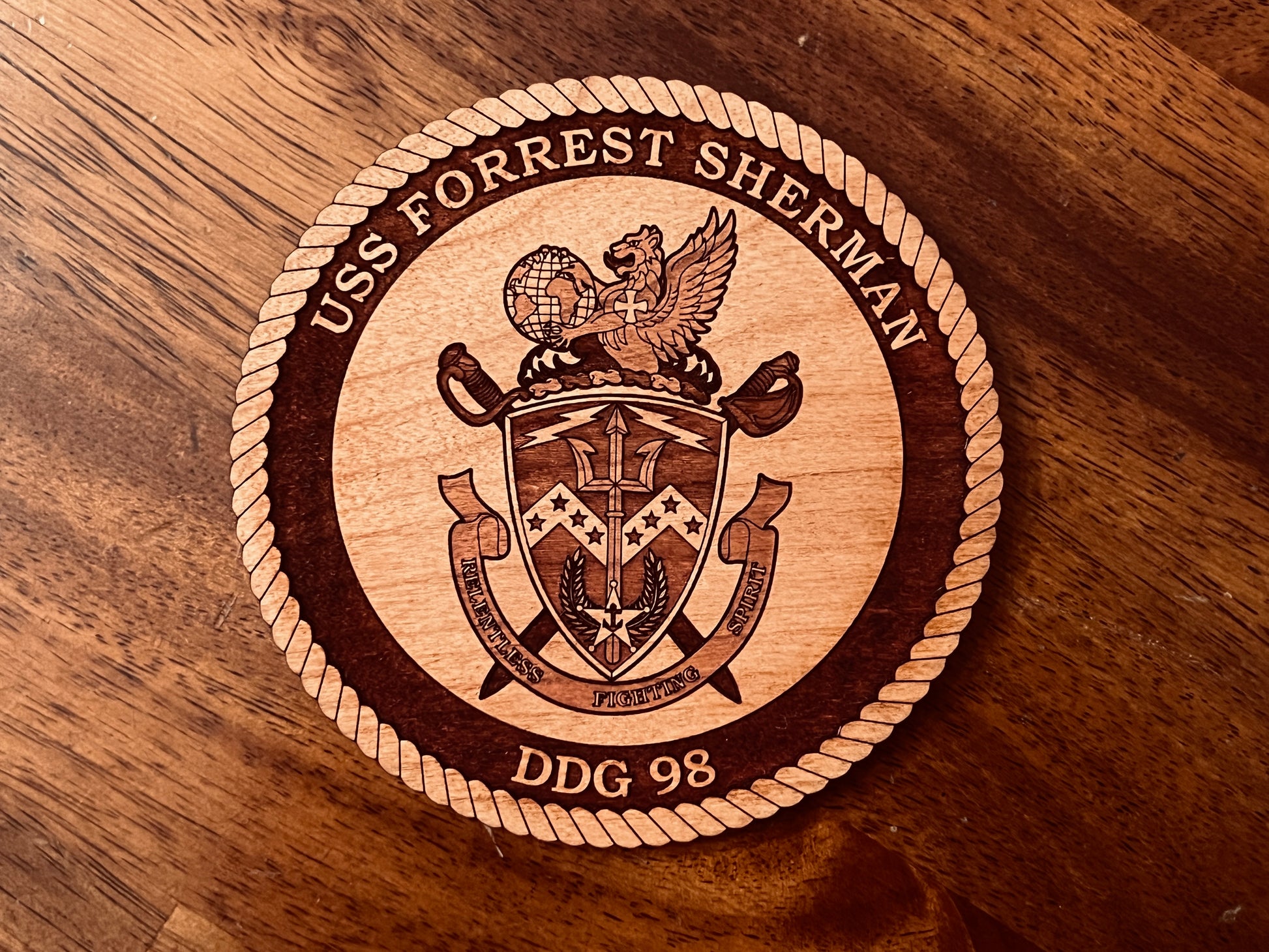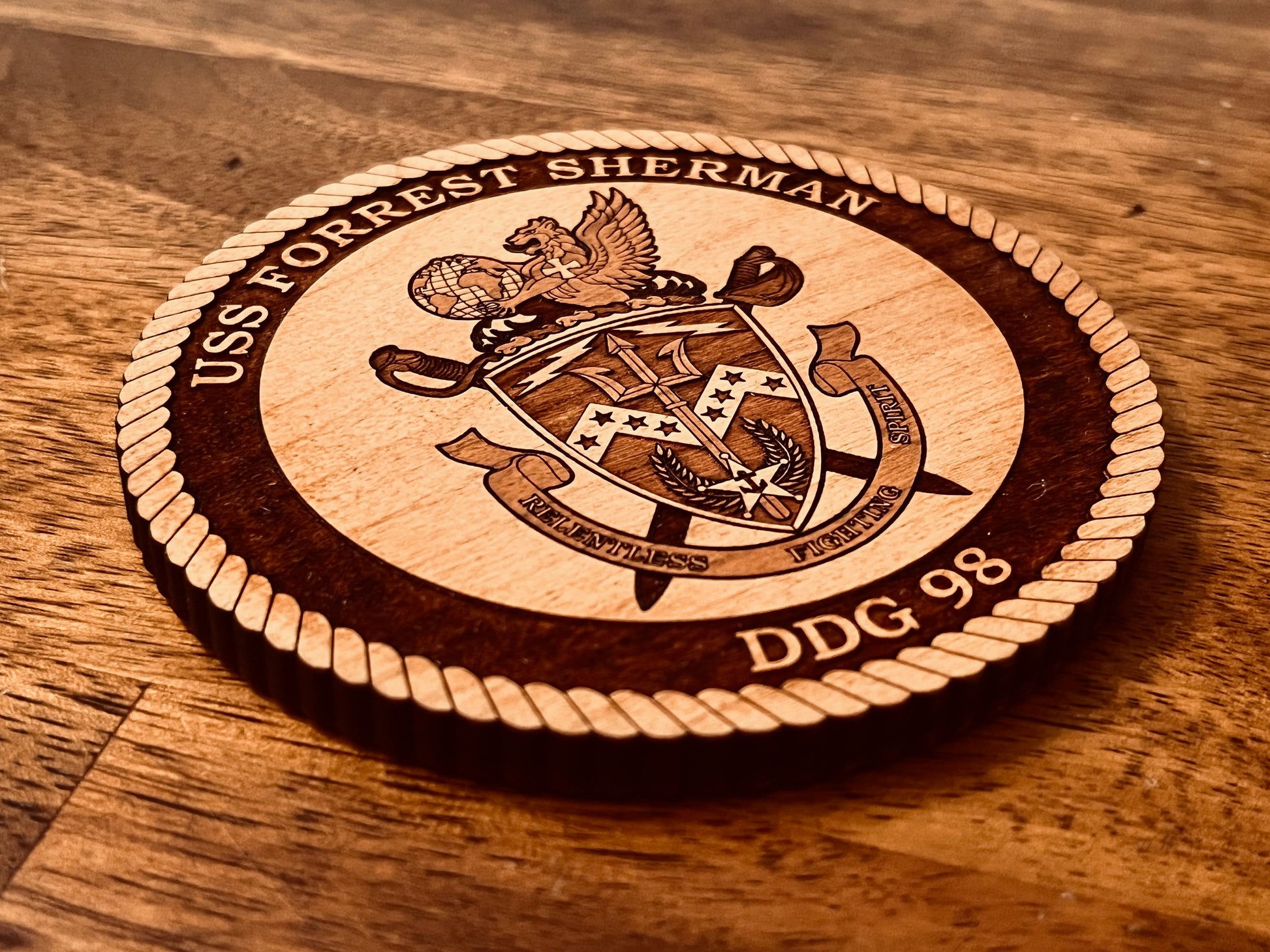 Honor the legacy of the USS Forrest Sherman (DDG 98) with this premium laser-engraved cherry wood coaster. Finely crafted from solid hardwood, this coaster showcases an intricately detailed engraving of the ship's official crest, featuring bold lines and fine textures that highlight the precision of our engraving process.